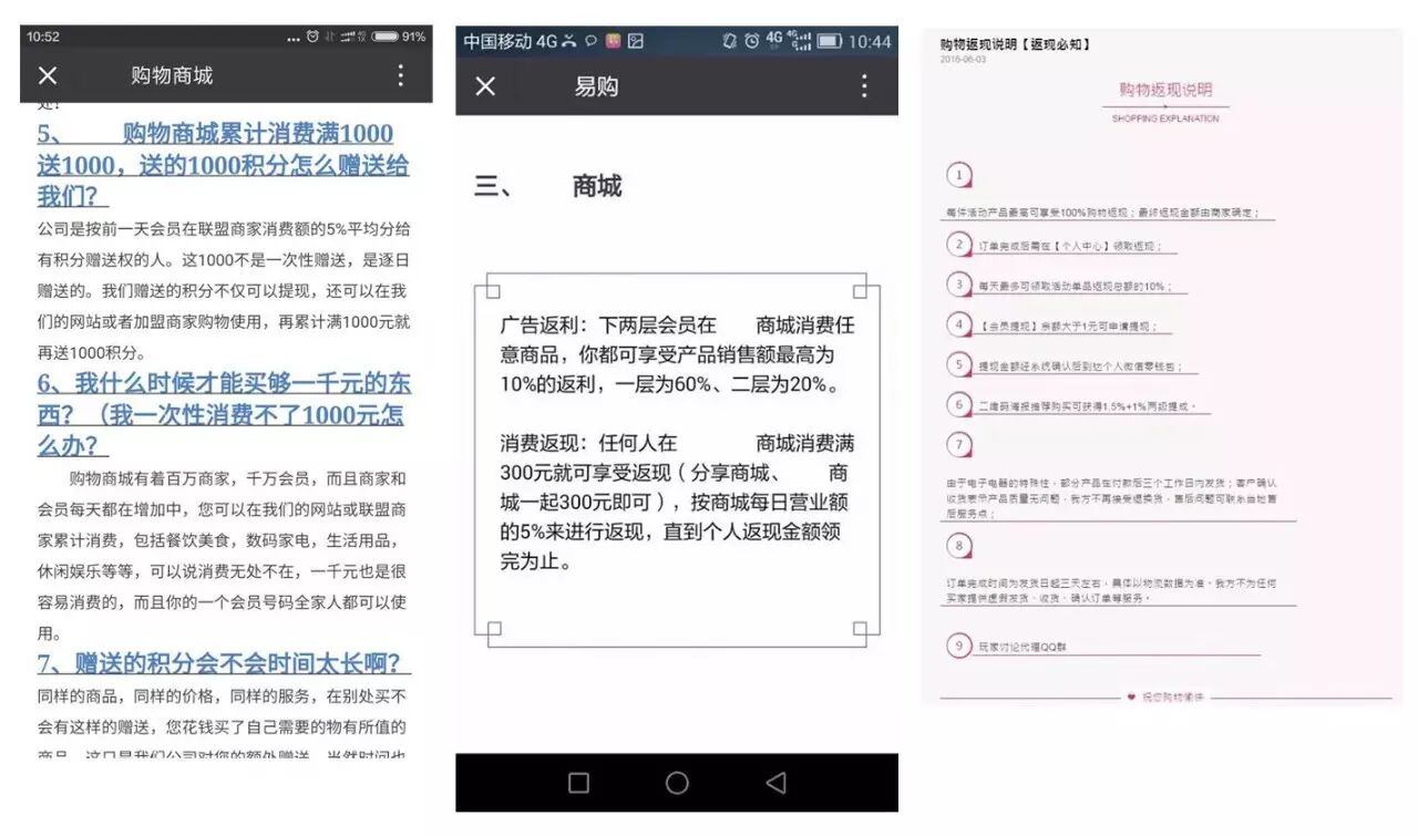 “近期,平台发现有用户利用微信关系链,通过微信公众帐号、微信支付实施高额返现返利行为。此行为模式多数表现为消费佣金返现返利、多级多层返现返利等(违规示例如下),一定程度上体现了金字塔欺诈、庞氏骗局等行为特征。其本质上是欺诈行为,即以高额返现返利吸引用户参与、以新入用户资金来支付原有用户的返现返利,形成层压式资金链条。